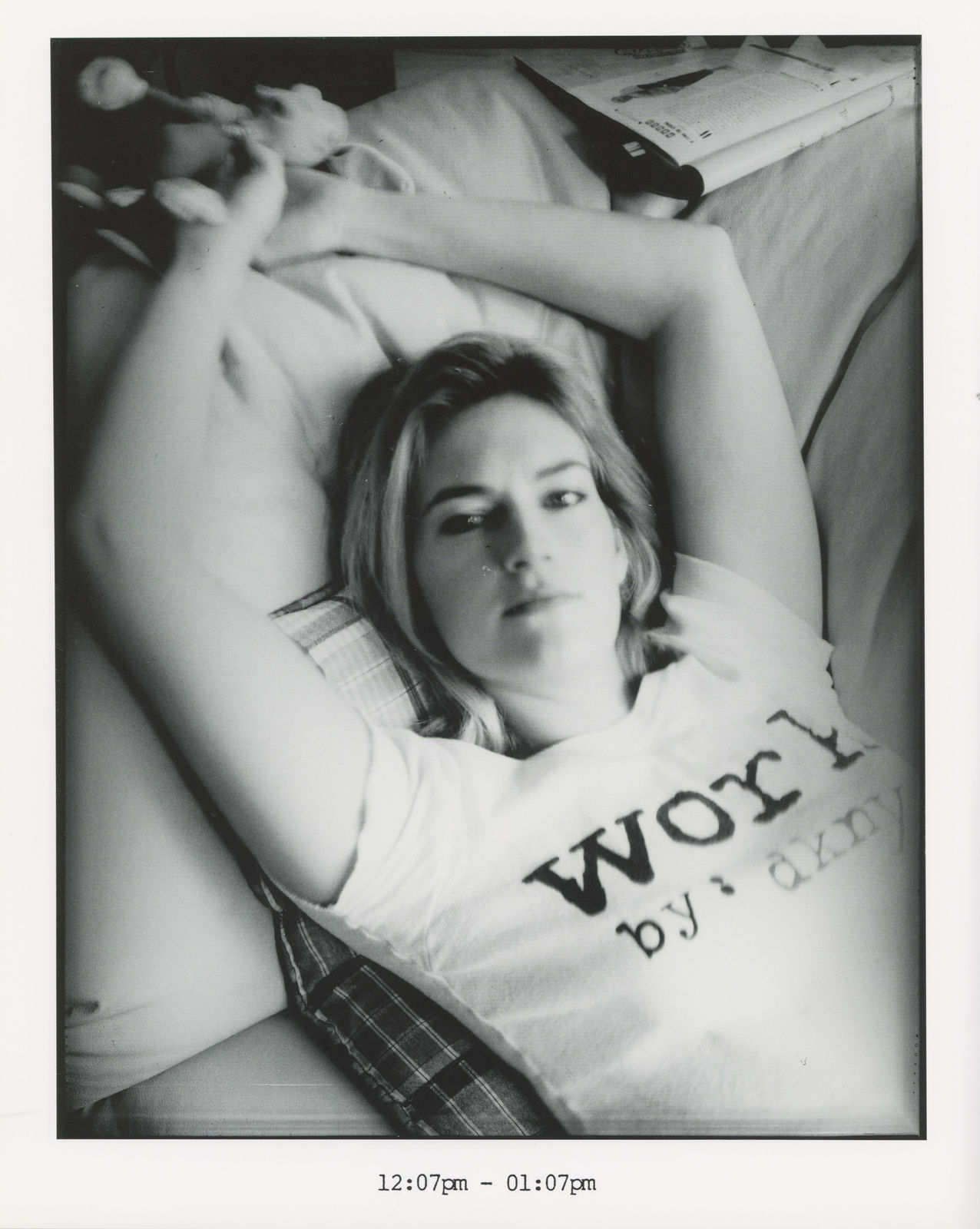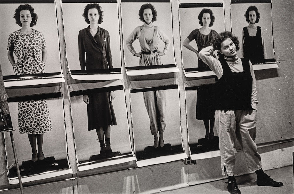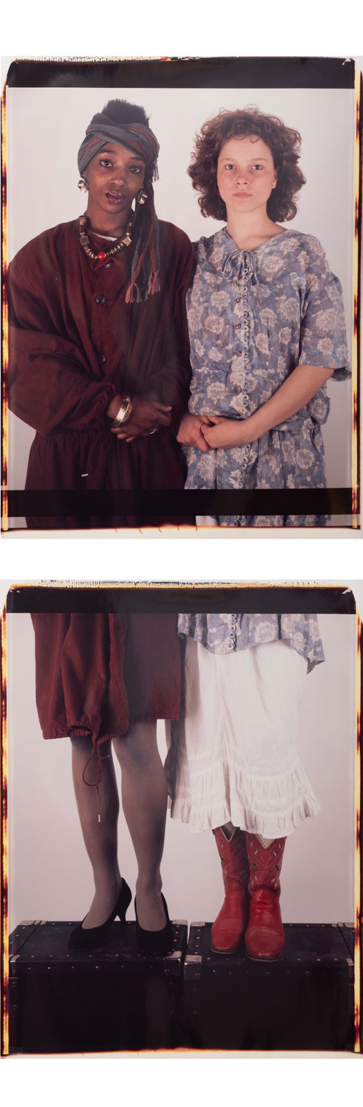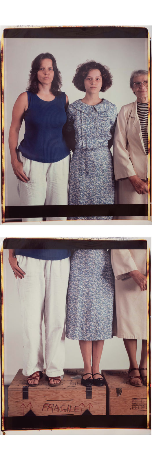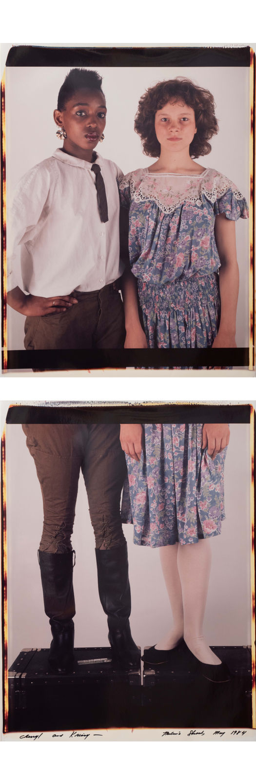 Melissa Shook (1939-2020) invited her parents, her teenage daughter Krissy, and Krissy’s friend Cheryl to participate in a photo session. Krissy and Cheryl posed in a variety of outfits with a fashion-modeling flair, while Shook and her parents appeared in plain, everyday attire. Shook photographed the upper and lower bodies separately, then vertically combined the two frames, seemingly to amplify the impact of the large-format Polaroid. Krissy dominates the project with multiple solo frames of her upper body.