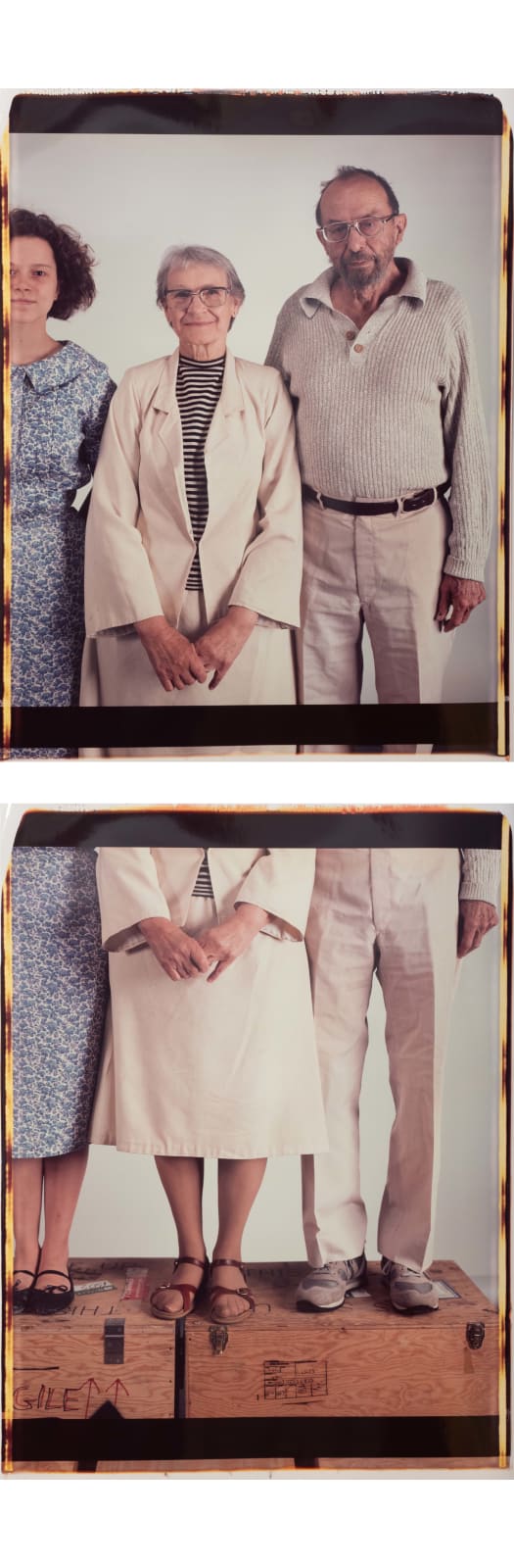 Melissa Shook (1939-2020) invited her parents, her teenage daughter Krissy, and Krissy’s friend Cheryl to participate in a photo session. Krissy and Cheryl posed in a variety of outfits with a fashion-modeling flair, while Shook and her parents appeared in plain, everyday attire. Shook photographed the upper and lower bodies separately, then vertically combined the two frames, seemingly to amplify the impact of the large-format Polaroid. Krissy dominates the project with multiple solo frames of her upper body.